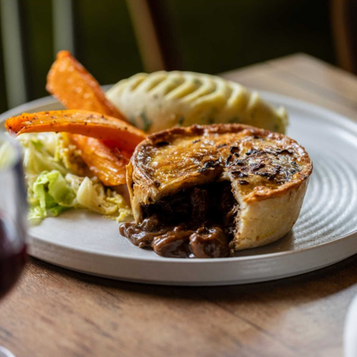 Wild mushroom bourguignon pie, skin-on chips, cabbage, roasted carrots (ve) | 15.50 1515 kcals